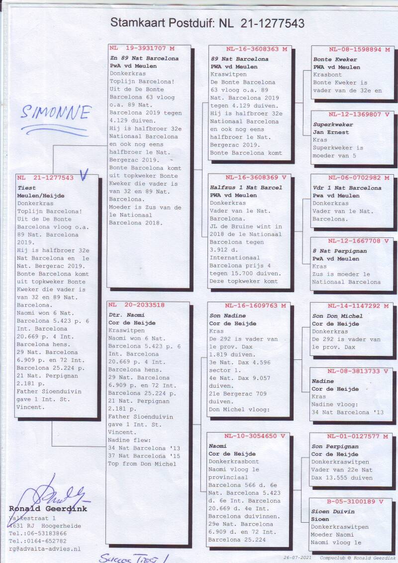 Jelle Jellema won met ‘Silke’ de 1e Nationaal Barcelona, met twee kleinkinderen van ‘Silke’ won Jelle in 2020 van Nationaal Barcelona prijs 24 en prijs 40. In 2021 wint Jelle wederom met de 17-1732264 de 6e Nationaal Barcelona die in 2020 de 24e Nationaal Barcelona won!