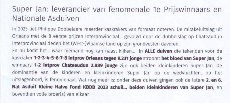 MAAR .....ZELFS IN DE BESTE FAMILIES VERTOEVEN ER WAARDELOZE DUIVEN . ANDERZIJDS ZITTEN ER OOK WEL BROERS EN ZUSSEN TUSSEN MET MINDERE UITSLAGEN OP DE WEDVLUCHTEN ( OF ZELFS GEEN ) DIE GRANDIOOS DE SUPERGENEN DOOR GEVEN .